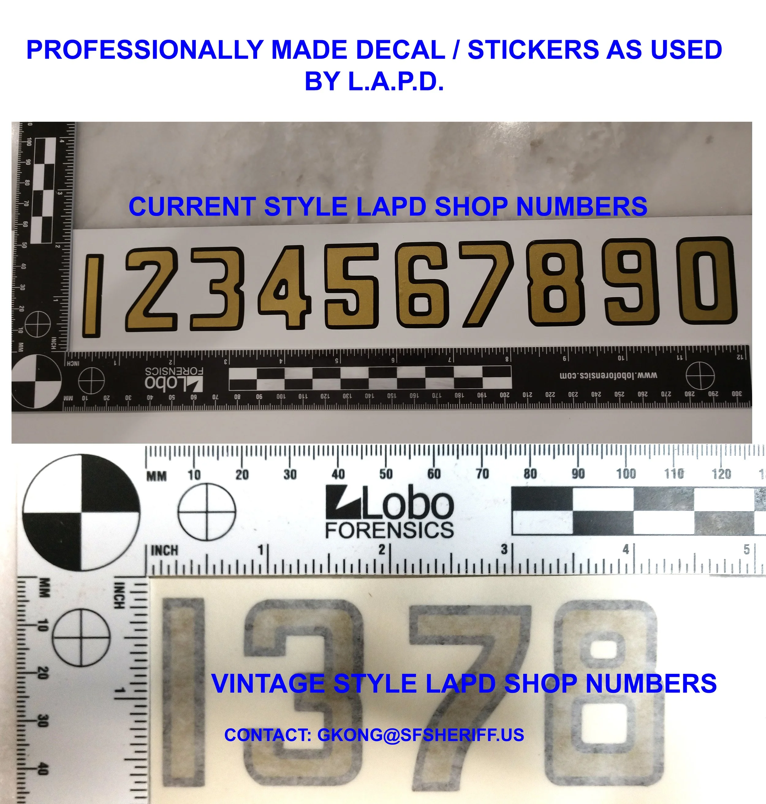 We offer LAPD SHOP NUMBER DECALS. A department issued set of numbers was faithfully recreated by a commercial sign and auto decal shop. We offer the current number fonts and also a supplemental "Vintage Font" set with the distinctive 3, 7, and 8. In stock. Contact us if interested.