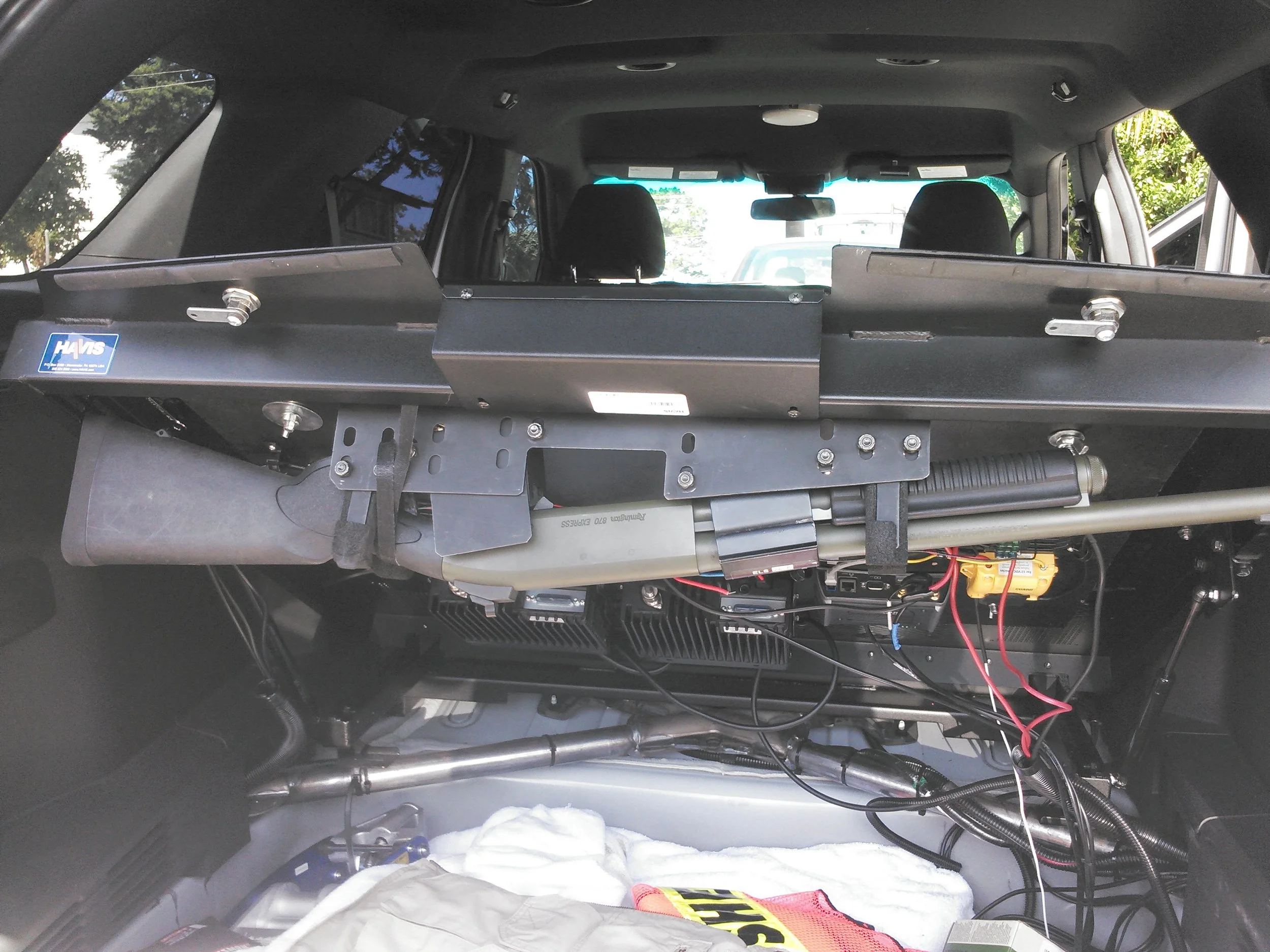 Closeup of weapons rack in Ford PIU unmarked vehicle.